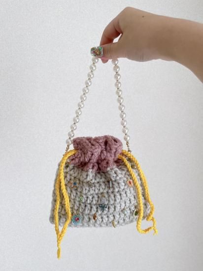 編んで作った巾着にビーズやmelancholilyのモチーフチャームをたくさんつけました。